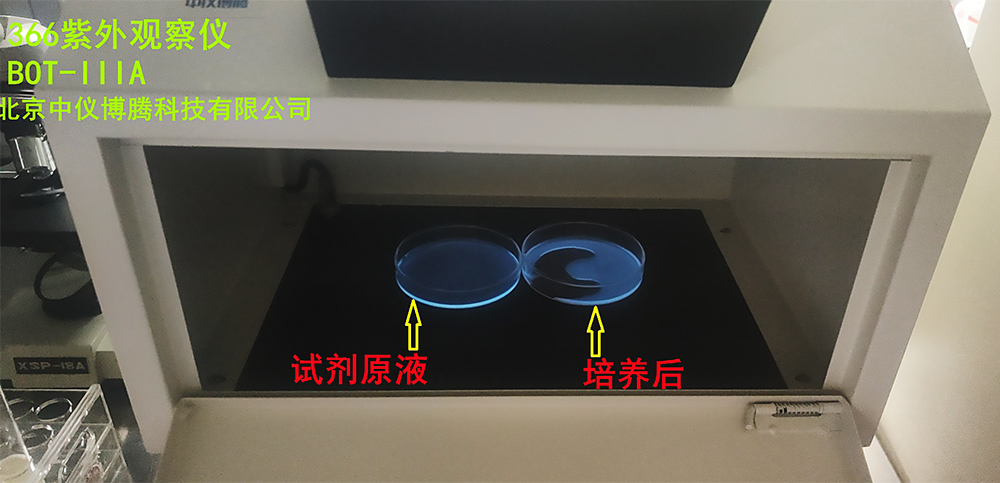 大腸埃希氏菌測定熒光觀察使用方法:將臺式紫外光燈置于暗處,插上電源,將經(jīng)過24小時培養(yǎng)后的EC-MUG管在燈下照射,如有藍色熒光產(chǎn)生則為大腸埃希氏菌陽性管;